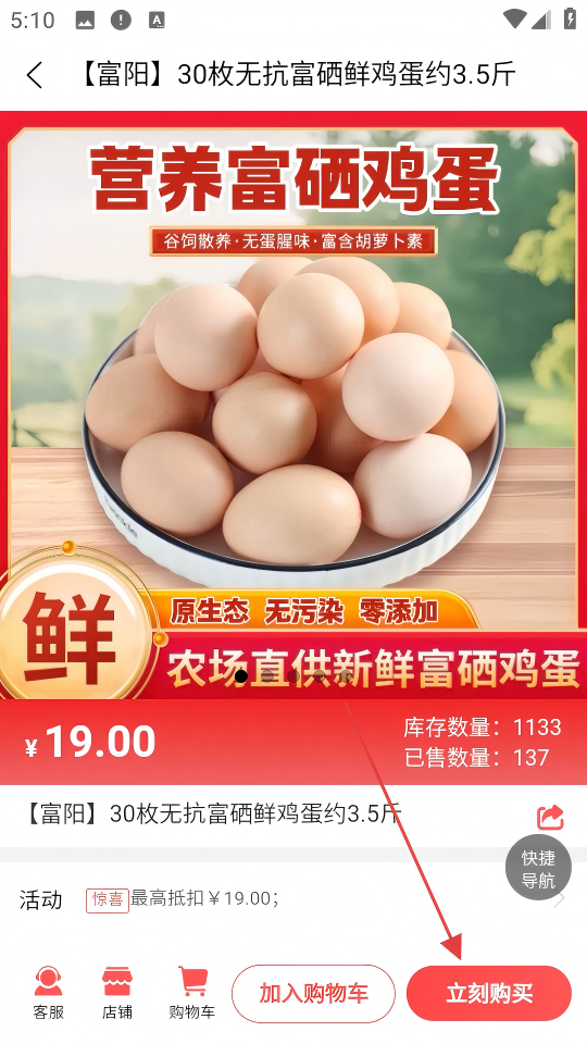 3、在商品列表中选择【【富阳】30枚无抗富硒鲜鸡蛋约3.5斤】,进入该商品详情页。