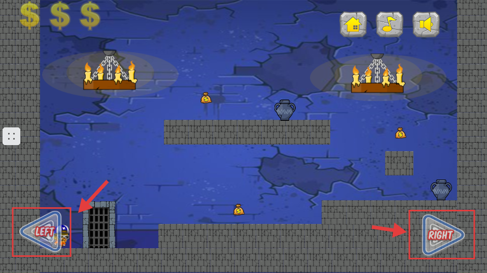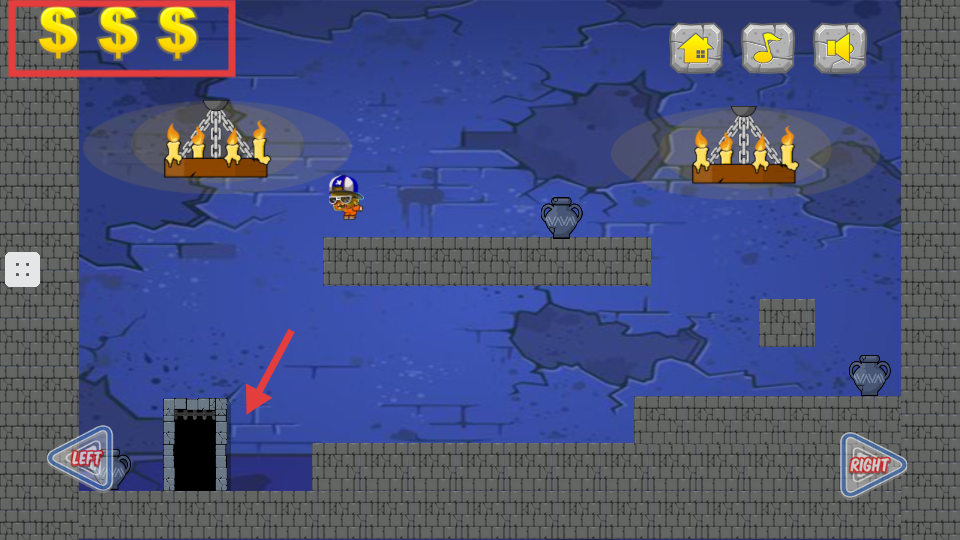 2、关卡场景中用左右侧的【LEFT】【RIGHT】箭头控制角色移动,收集散落在场景的金币。