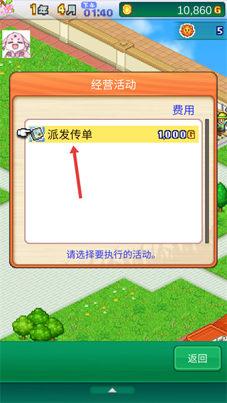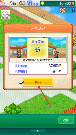 3、在经营活动界面选择【派发传单】活动,花费1000G对动物园进行宣传。