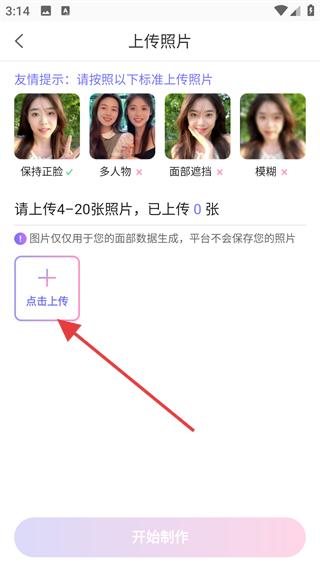 4、在上传页点击【点击上传】,按要求上传4-20张符合标准的照片(保持正脸等)。