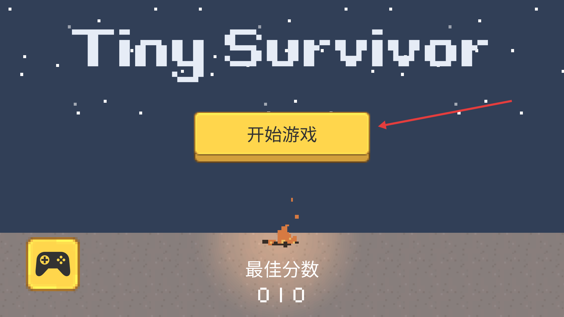 1、首次进入【小小生存者】,点击界面中央的【开始游戏】按钮即可开启像素风格的生存挑战,体验无广告干扰的冒险。