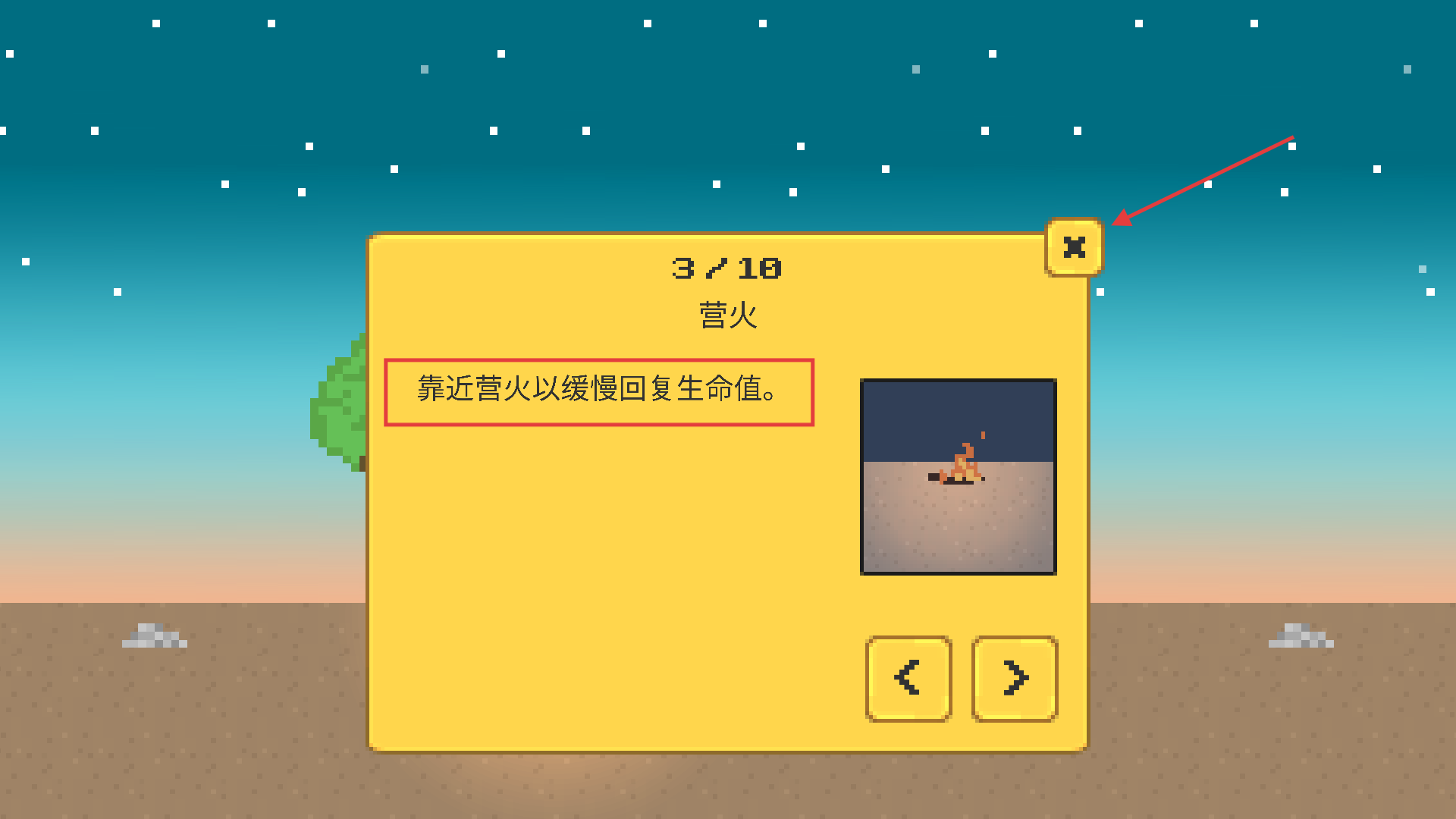 2、当出现营火提示时,记住靠近【营火】可缓慢恢复生命值,完成提示后关闭弹窗继续探索生存场景。
