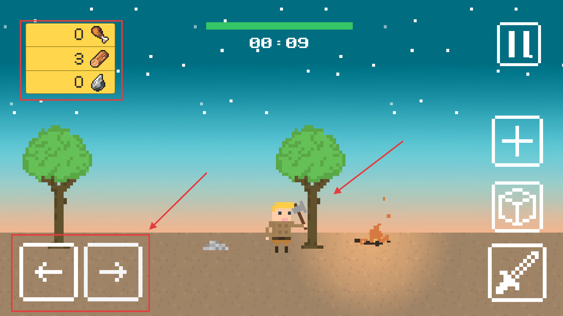 3、进入游戏后,先通过左右移动按钮靠近树木,点击砍伐获取【木材】,同时关注左上角资源数值的变化。
