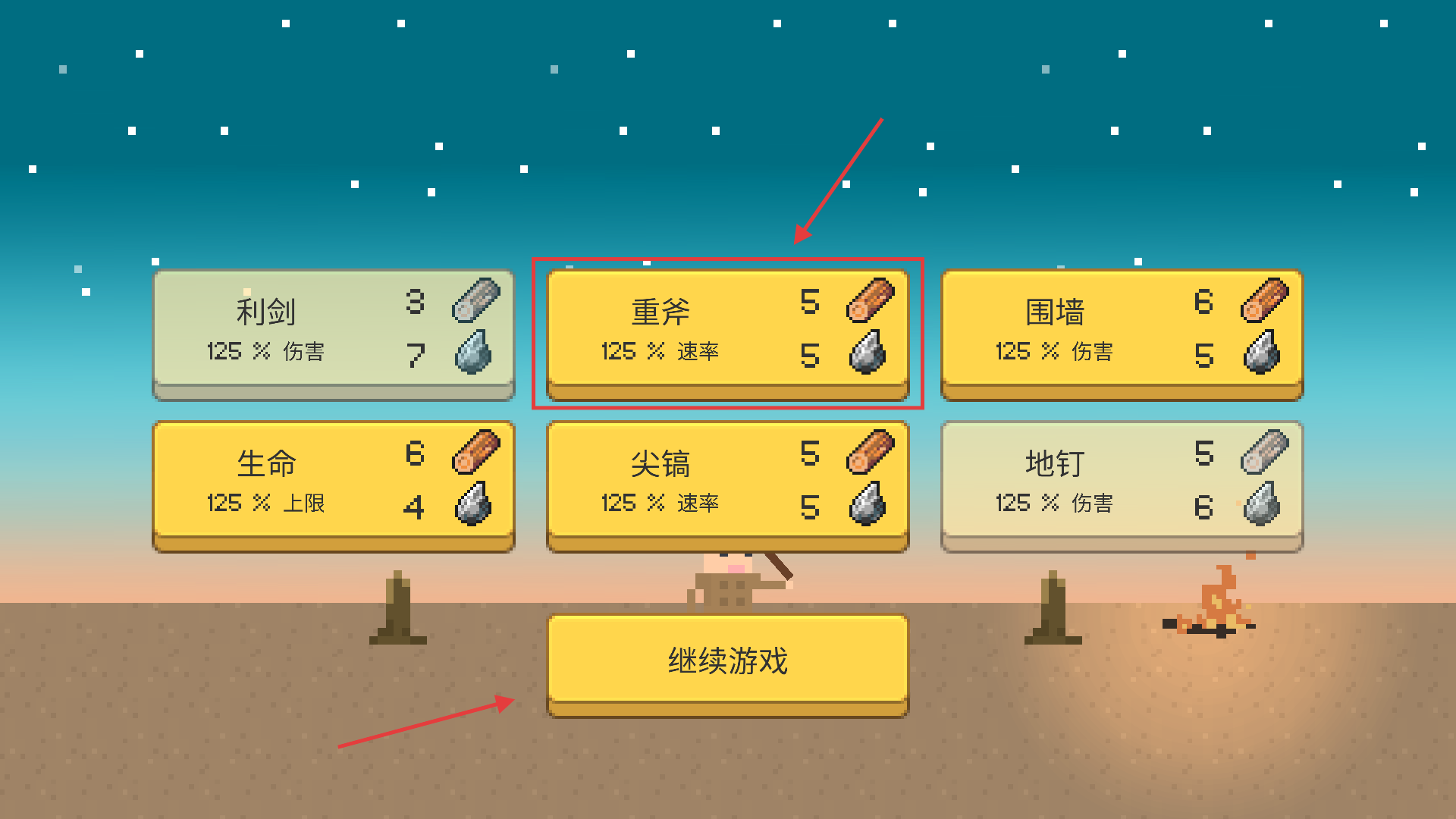 4、收集足够资源后,打开建造界面,可选择制作【重斧】提升采集速率,或建造【围墙】增强防御能力再继续游戏。