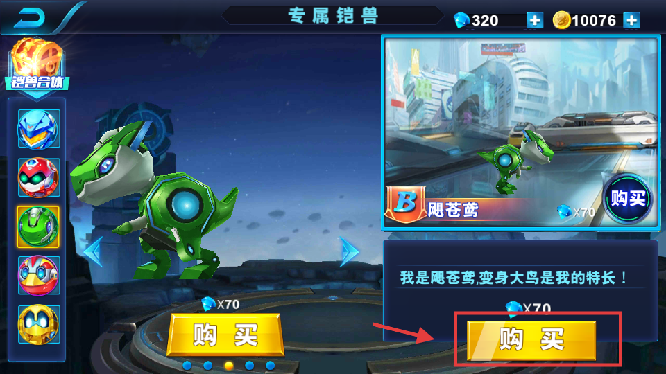 1、在专属铠兽界面,凑齐70钻石可购买【飓苍鸢】,其变身大鸟特长可辅助战斗。