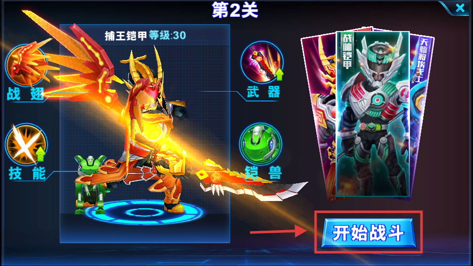 2、第2关配置好【捕王铠甲】等后,点击【开始战斗】,开启关卡挑战。