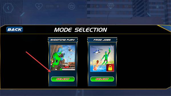 1、在模式选择界面,选择“ShootingFury”模式,点击【SELECT】进入射击战斗场景。
