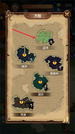 1、在地图界面,点击红色箭头指向的【沼泽】区域,进入该场景开始探索。