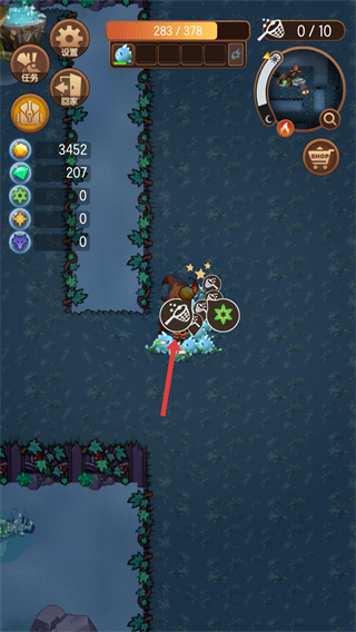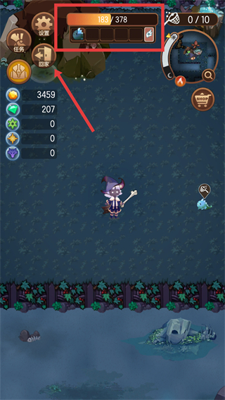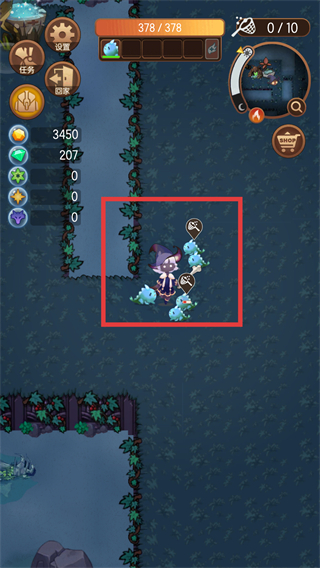 2、在沼泽场景中,操控红色框内的女巫移动,靠近蓝色精灵准备进行捕捉。