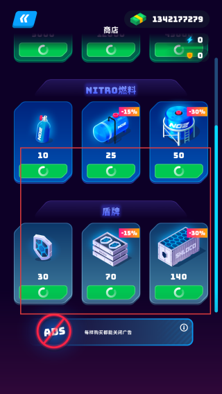 1、在商店中消耗对应货币购买【NITRO燃料】【盾牌】等道具,助力比赛。