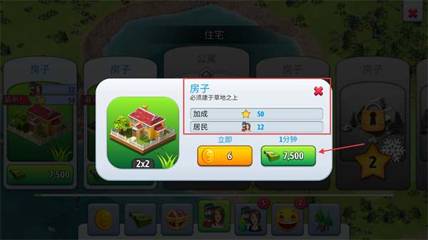 2、建造住宅需选草地地块,【房子】提供12居民与50星加成,选择合适时机建造以快速提升城镇人口与幸福指数。