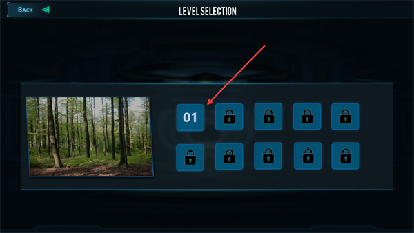 1、进入【LEVEL-SELECTION】界面,选择已解锁的【1】关卡,后续关卡需完成前置关卡解锁。