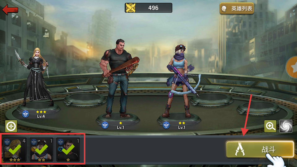 2、出战前需在下方选中可用英雄,确认阵容后点击【战斗】,即可带领选中英雄出征。