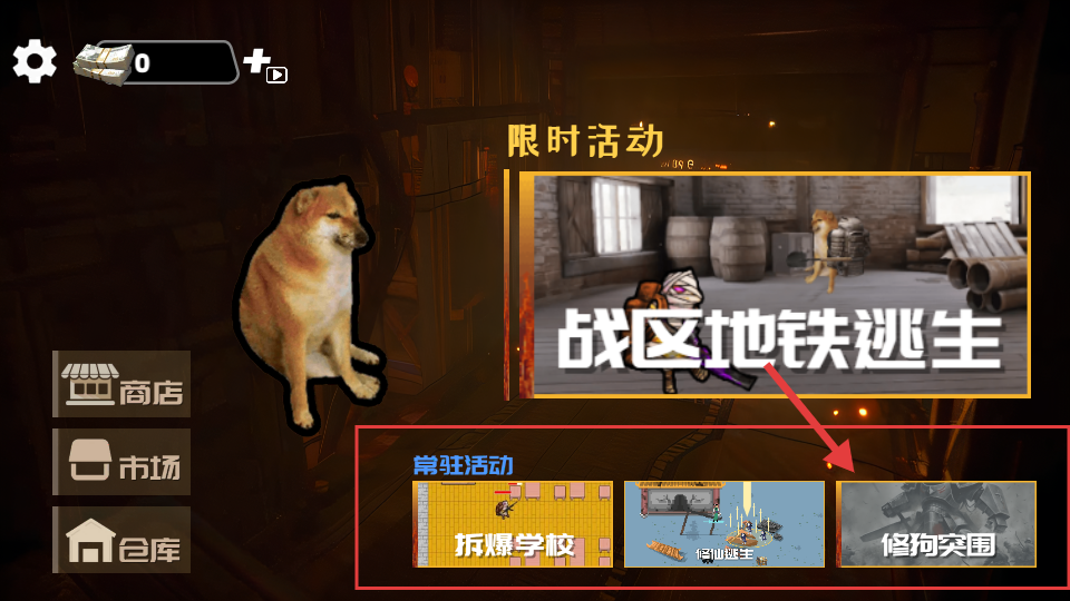 1、进入游戏主界面,先熟悉【商店】【市场】【仓库】功能,可参与【限时活动-战区地铁逃生】或【常驻活动-拆爆学校】【常驻活动-修勾突围】等获取资源。