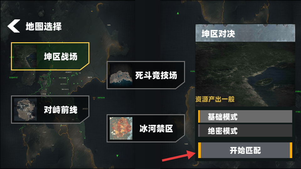 2、在【地图选择】界面选【坤区战场】等地图,挑【基础模式】或【绝密模式】,点击【开始匹配】进入对战。