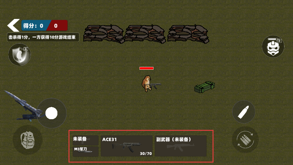 3、战斗时用【ACE31】步枪或【M3军刀】攻击,击杀得1分,捡【弹药包】补充,先到10分的一方获胜。