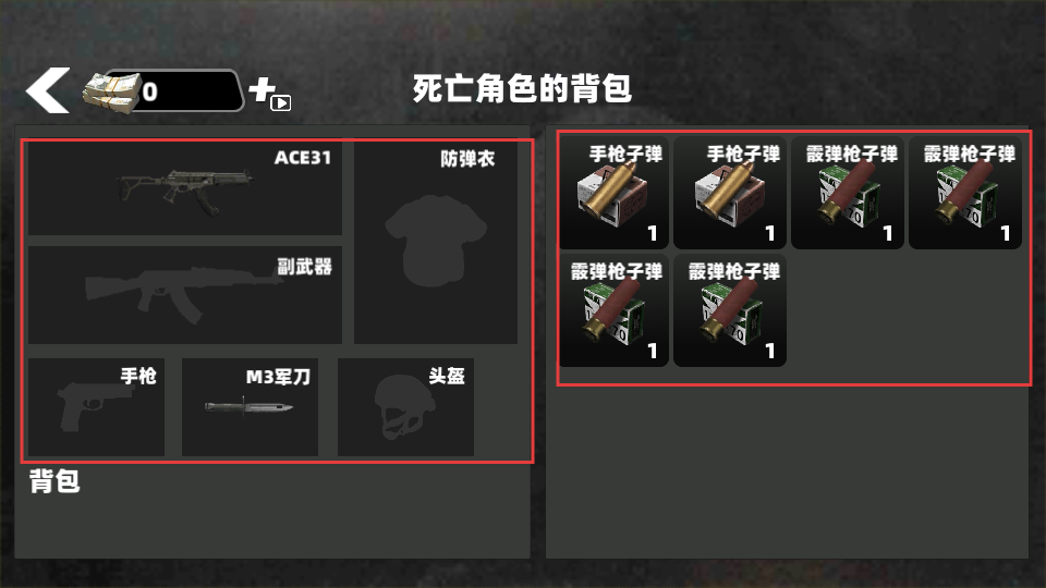 4、击败敌人后,打开【死亡角色的背包】,可捡【ACE31】【防弹衣】【头盔】【手枪子弹】等资源提升战力。