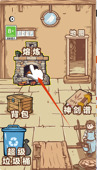 5、成功锻造各类剑器后进入地图闯关,超级垃圾桶内收集更多材料,继续打造更强大的天下神剑。