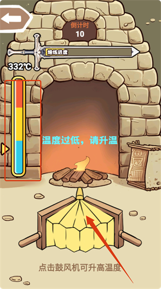 5、选择已有的材料进行熔炼锻造过程,通过控制温度在合适区域完成铸造,体验打造神兵的乐趣。