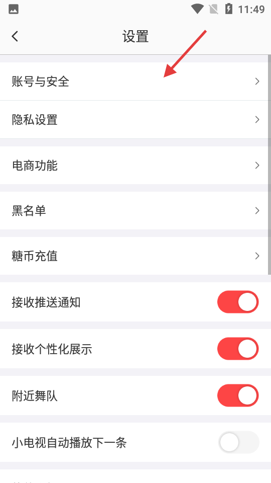 2、在设置界面点击【账号与安全】,进入账号与安全页面。