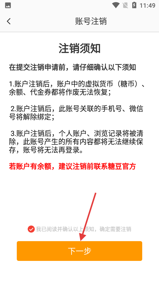 4、勾选“我已阅读并确认以上须知,确定需要注销”后,点击【下一步】,按照提示完成账号注销操作。