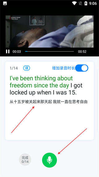 4、进入配音流程,查看【英文句子-翻译】对照内容,点击麦克风按钮完成配音。