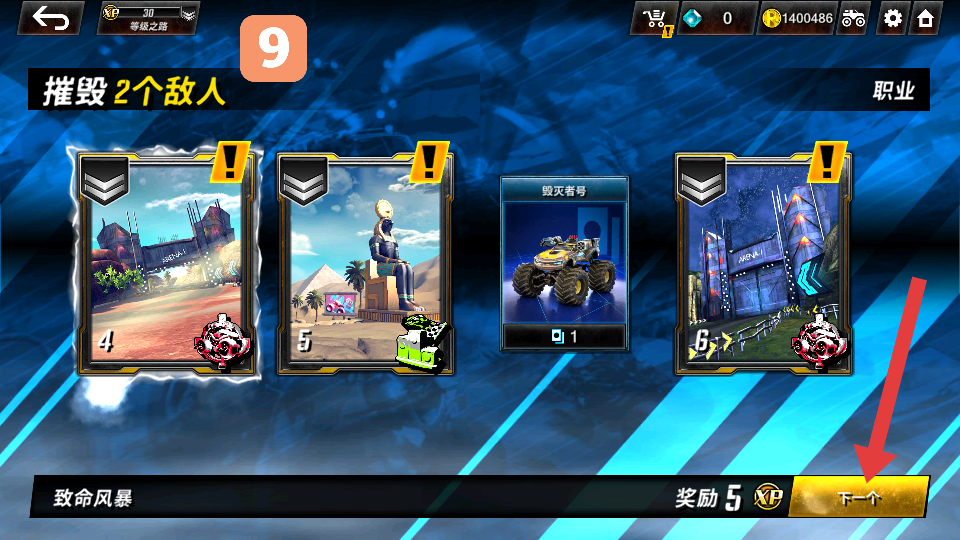 1、在关卡选择界面,点击【下一个】,进入新的比赛关卡,明确当前任务目标(如摧毁2个敌人)。