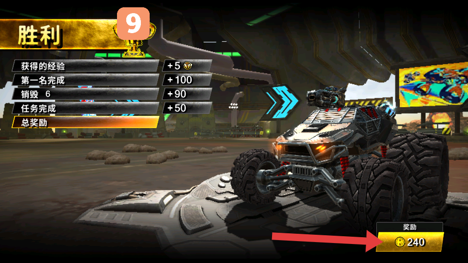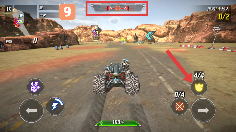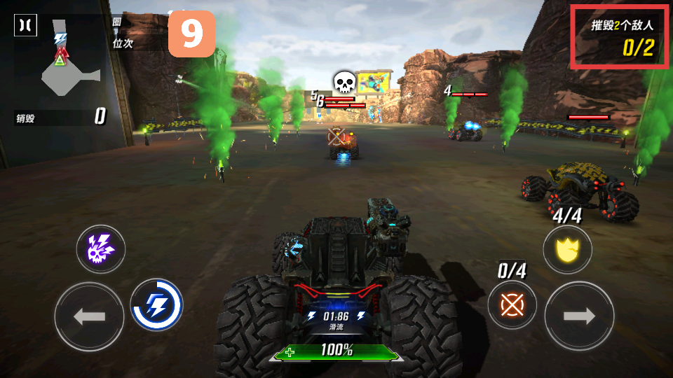 2、进入比赛后,注意右上角的任务进度(如摧毁敌人的数量),驾驶武装赛车在赛道上行驶,寻找敌人。