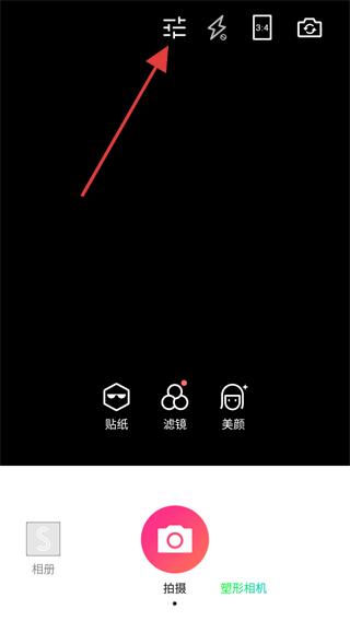 1、进入潮自拍拍摄界面,点击顶部功能按钮,切换到包含拍摄设置的界面。