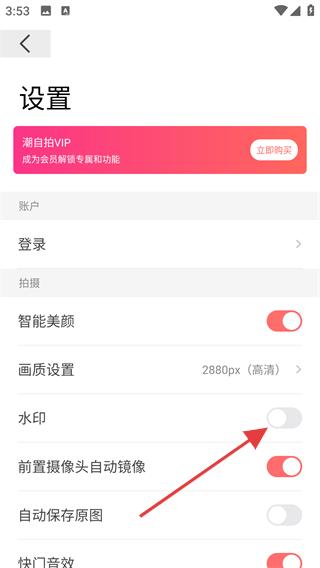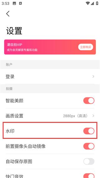 4、目前潮自拍的基础设置中无直接改水印名字的选项,需开通VIP后使用专属水印功能自定义名称。