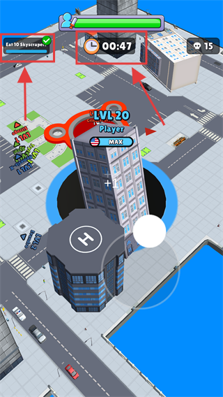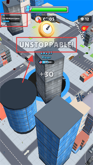 2、触发【UNSTOPPABLE】无敌状态时,快速吞噬高楼等大型物体获取【+30】数值,利用无敌时间最大化提升黑洞等级。
