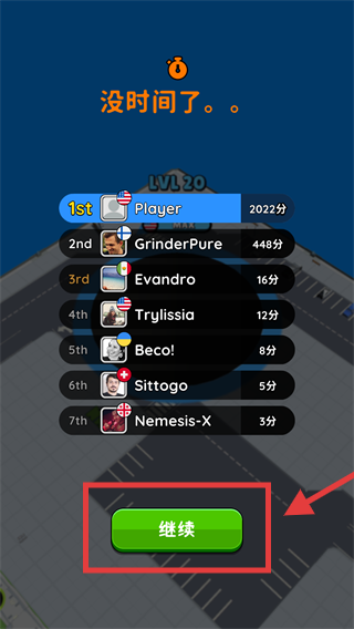 4、结算界面显示排名与分数,点击绿色【继续】按钮返回主界面,可选择新模式或重新挑战提升成绩。