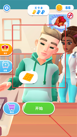 1、在【关卡2】界面,点击【开始】按钮,根据顾客对华夫饼的需求,开启美食制作挑战。