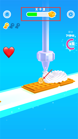 3、关注【关卡2】进度条,制作过程中收集金币,推进关卡进度,同时积累得分以提升关卡完成质量。