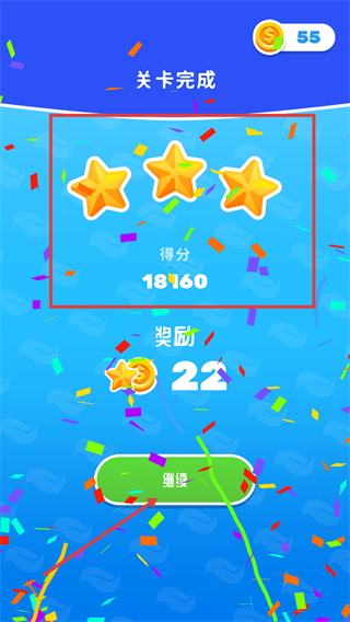 4、关卡完成后获得三星评分与【22】金币奖励,点击【继续】按钮,进入下一关继续美食制作之旅。