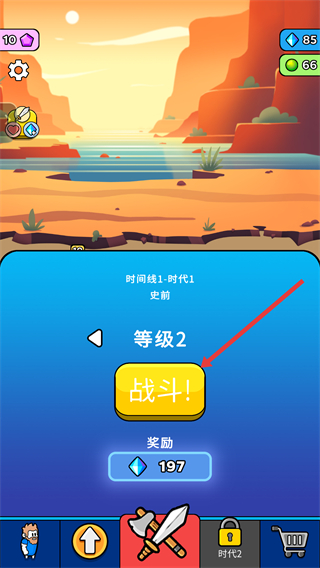 1、进入【时间线1-时代1-史前】界面,当前为【等级2】,点击【战斗!】按钮可参与战斗,完成后能获取【197】奖励。