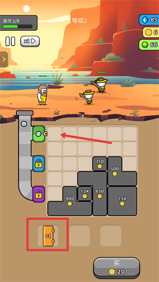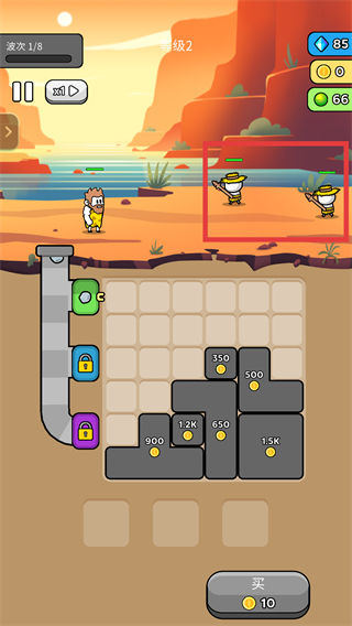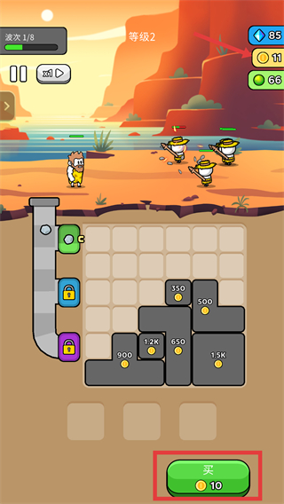 3、消灭敌人后,将会获得金币,点击红框标注的【买】按钮,消耗【10】金币进行购买道具。