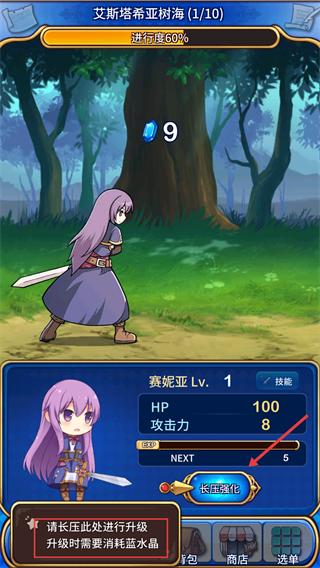 3、在角色面板使用【长按强化】功能,消耗蓝水晶升级赛妮亚提升HP与攻击力属性。