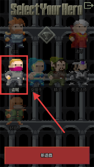 1、选择盗贼职业开启游戏,利用其独特技能,点击界面下方新游戏按钮进入地牢冒险流程。