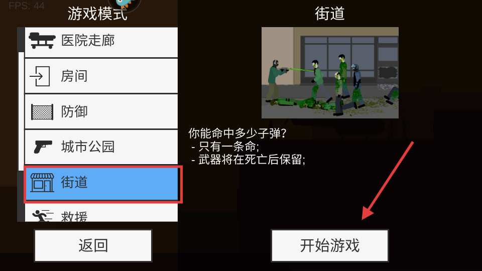1、选择【街道】模式后点击【开始游戏】按钮,即可进入对应的僵尸射击场景开始战斗。