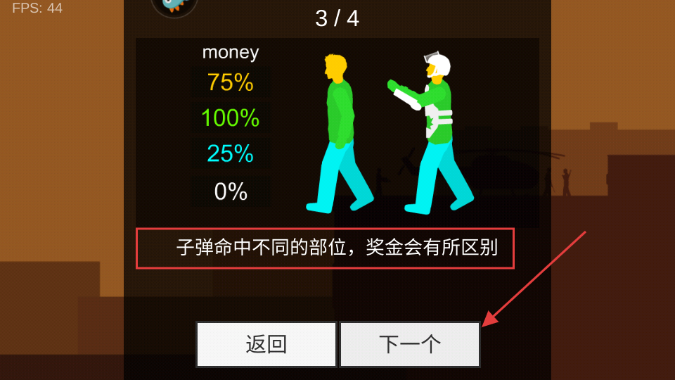 2、注意子弹命中不同部位奖金有区别,看完提示后点击【下一个】按钮继续了解规则。