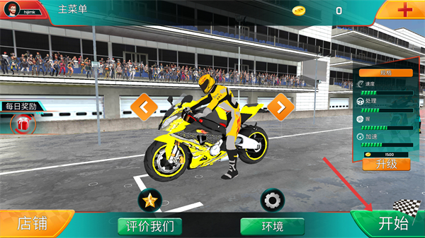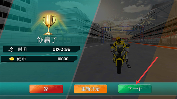 4、获胜后获得【10000】硬币奖励,点击【下一个】进入新赛事,积累奖励提升摩托性能。