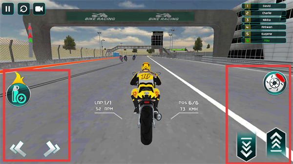 2、比赛中用左侧方向键(左右箭头)控制摩托转向,右侧按键调整速度,保持【55KM/H】左右的节奏,超越对手(当前排名6/6)。