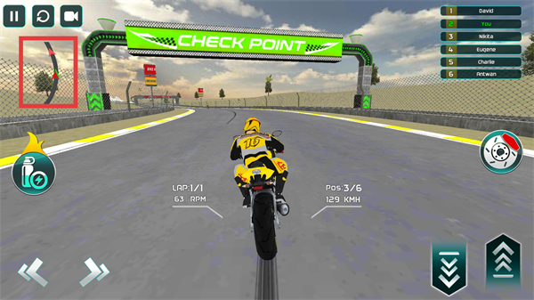 3、注意多观察红框到道路情况,速度提升至【129KM/H】,排名升至3/6,继续调整方向保持领先。