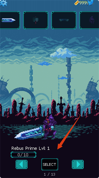 1、选择角色,点击【SELECT】进入游戏,可查看上方武器栏,熟悉角色和装备后开启冒险。