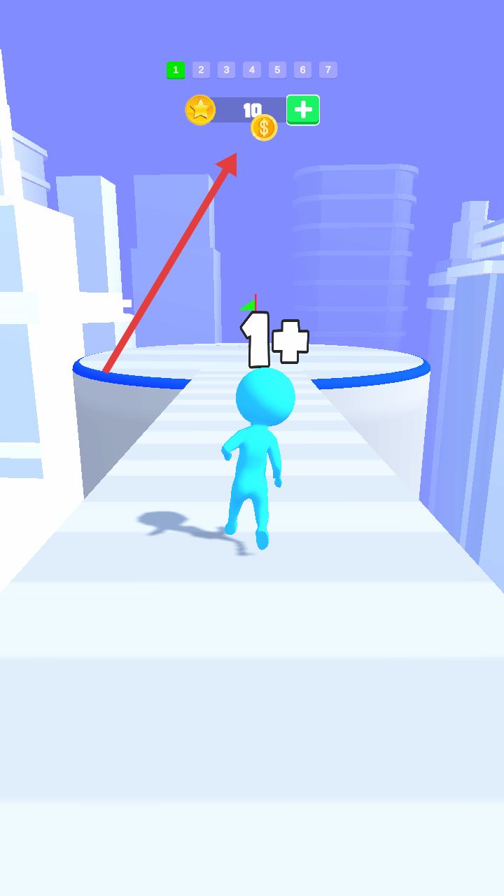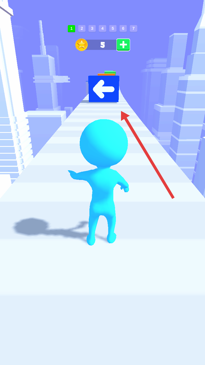 1、在城市赛道场景中操控蓝色小人,看到向左箭头时向左滑动,避开障碍。