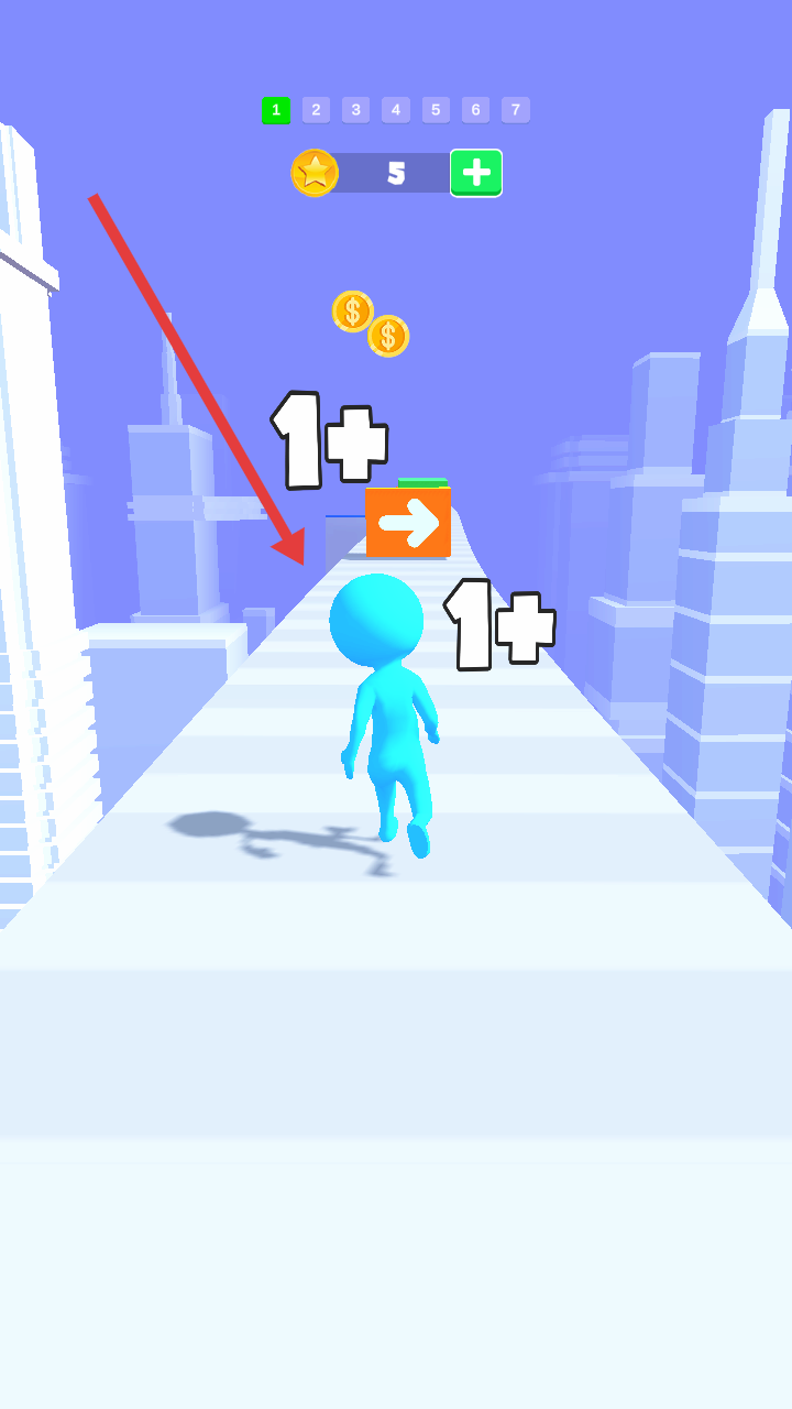 2、操控蓝色小人移动,避开带有箭头的障碍方块,收集金币,保持前进节奏。