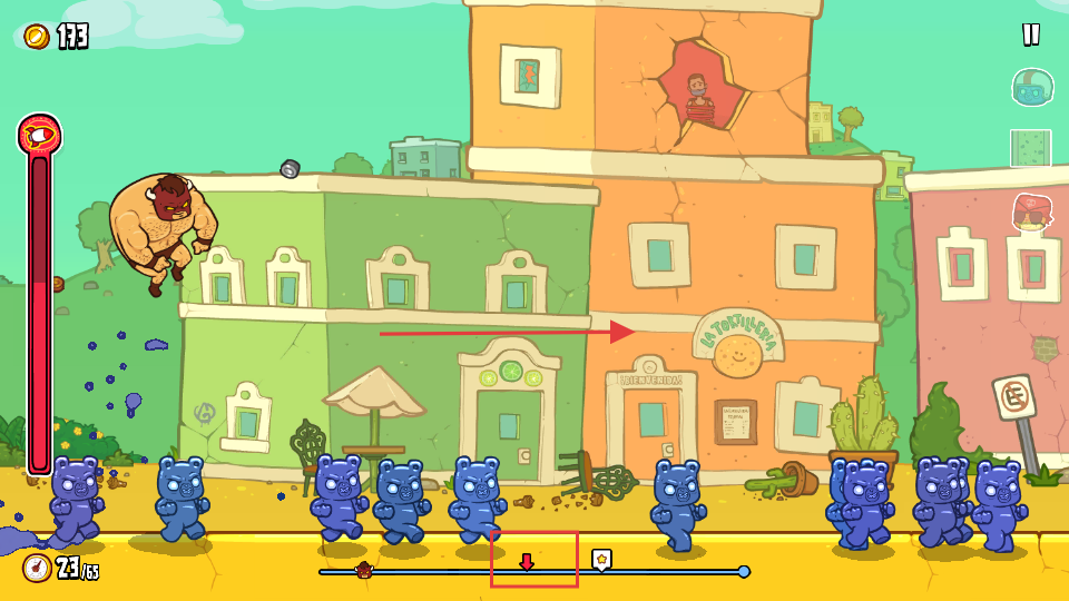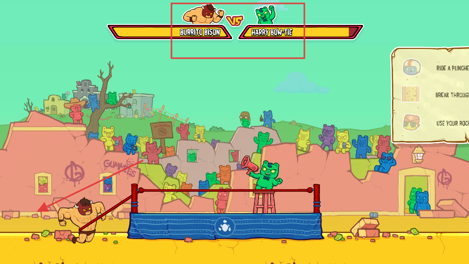2、在摔跤场中,与对手HarryBow-Tie展开对战,通过蓄力弹射BurritoBison,开启新的飞行冒险。