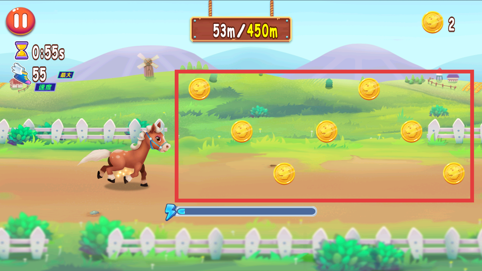 2、操控小马在场景中移动,收集红框内的金币,界面显示【53m/450m】进度与【2-金币】。