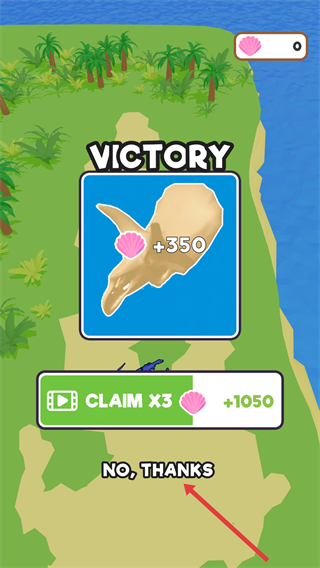 4、战斗胜利后,点击【NO,THANKS】按钮,领取奖励并继续游戏。